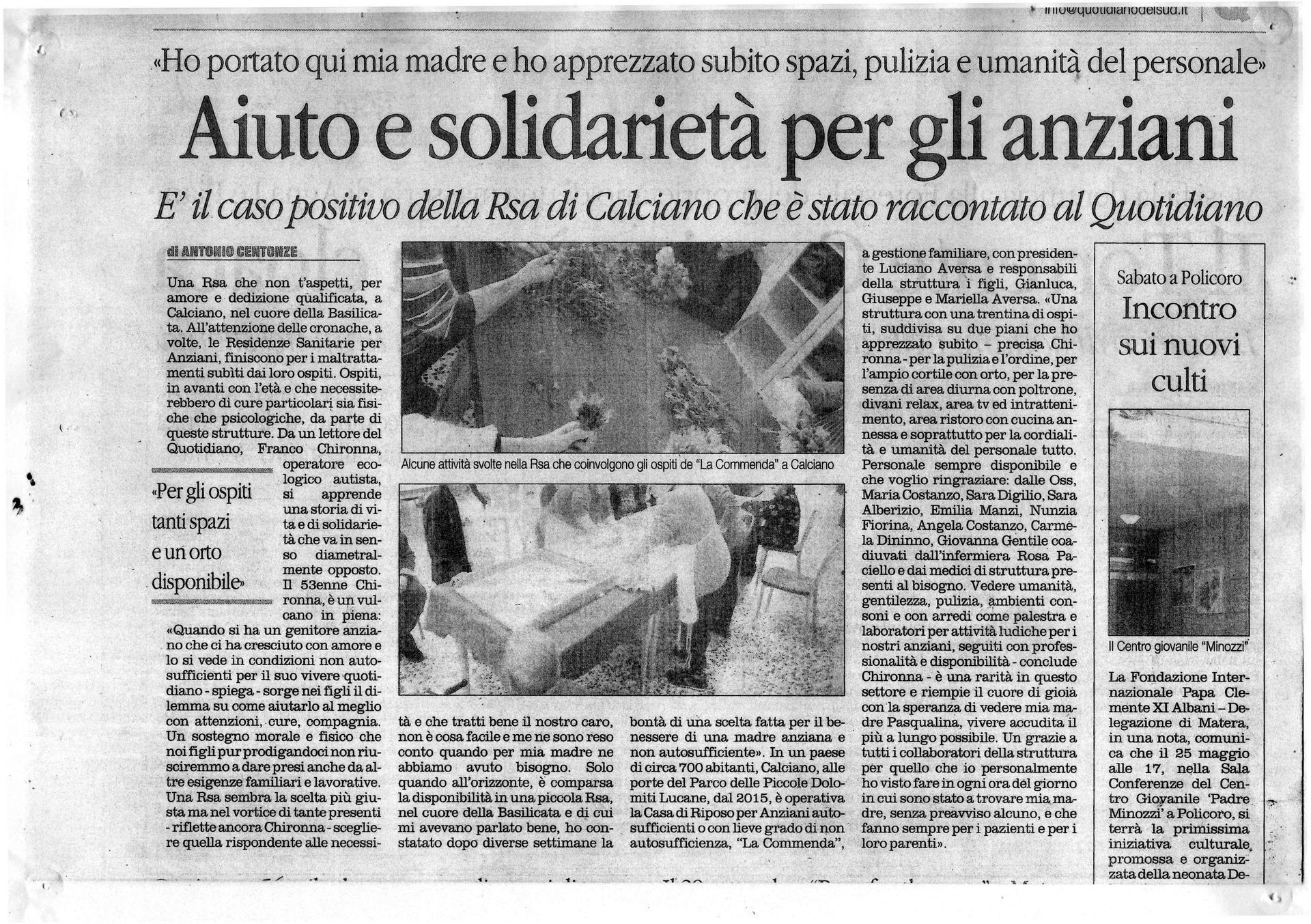 · Attività ricreative: Siamo felici di festeggiare insieme ad i nostri ospiti, coinvolgendo i loro amici e familiari, le ricorrenze più importanti quali, compleanni, Natale, Pasqua, festa del papà e della mamma ecc. Periodicamente proponiamo attività caratteristiche che rievocano ricordi, gesti e pratiche del loro passato, quali, laboratori di pasta, cura dell’orto, pulizia e conservazione piante officinali . Frequenti invece, momenti di ballo, ascolto musica e proiezioni di filmati della loro giovinezza.